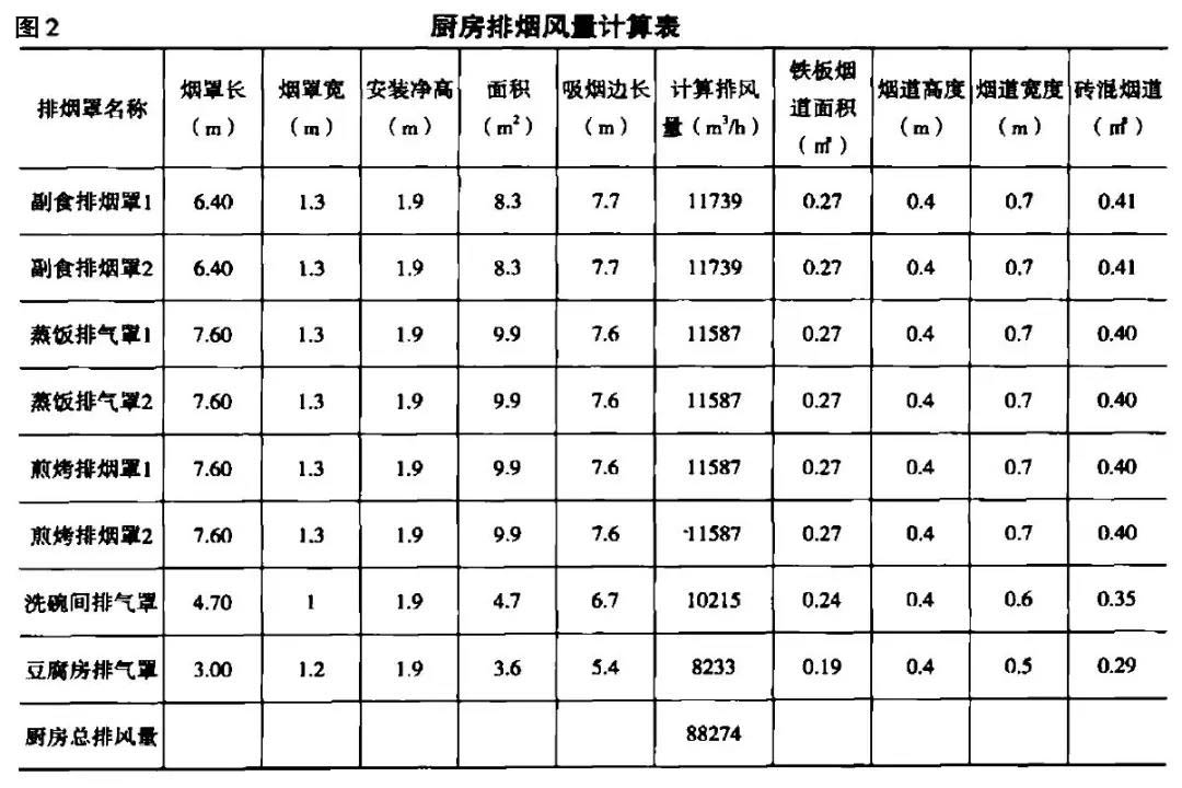 圖2是學校食堂廚房排煙風量計算表,表中列出了排煙罩的參數和計算的排煙風量。據計算表計算的數據,分析風速超常的原因。