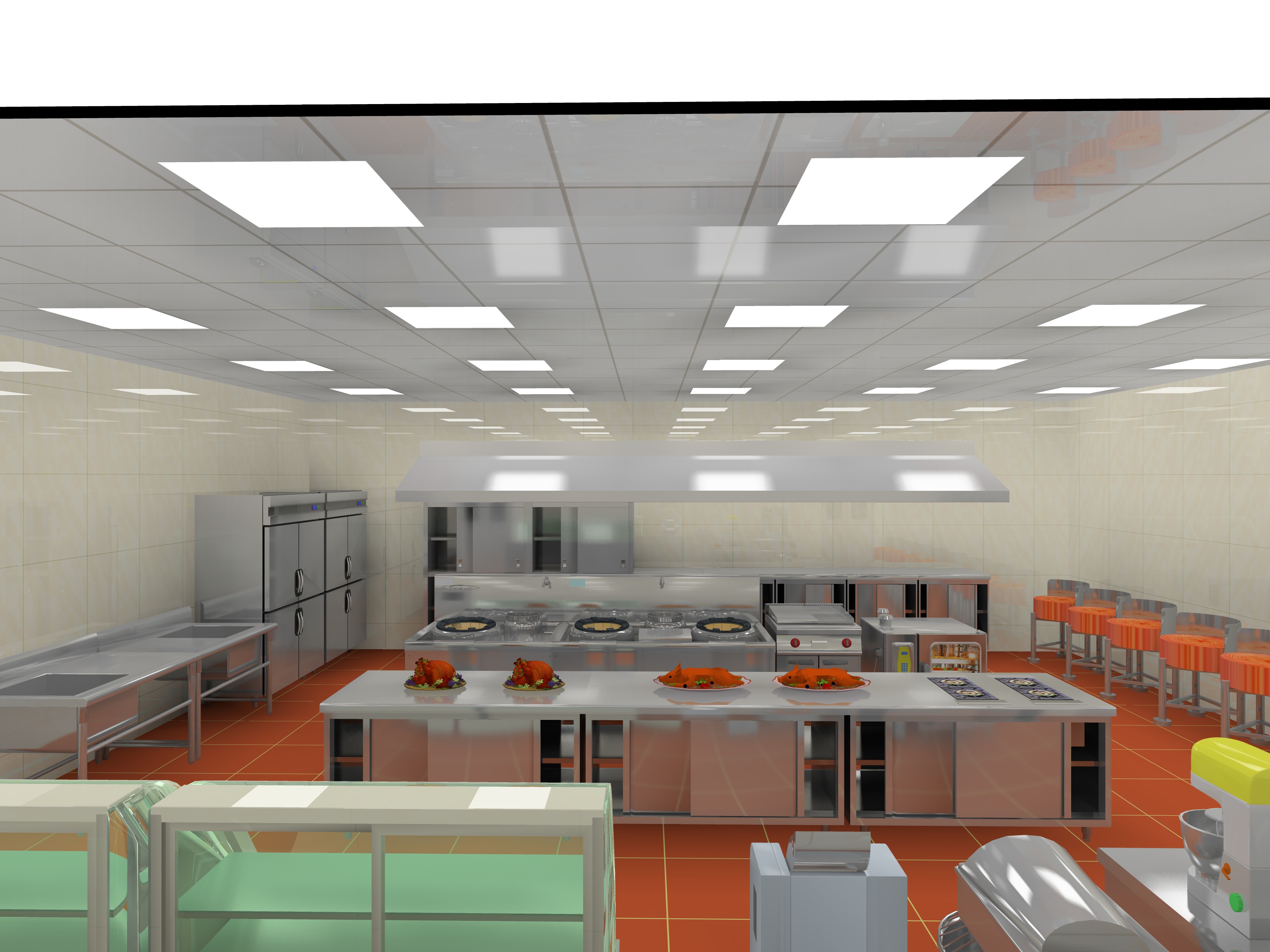 廚房的燈光看重文化和氣氛,而商用廚房看重的是實用。臨爐炒菜要有足夠的燈光以把握菜肴色澤,案板切配要有明亮的燈光,以有效防止刀傷和追求精細的刀工,出菜打荷的上方要有充足的燈光,保證食材和上菜的高效率。