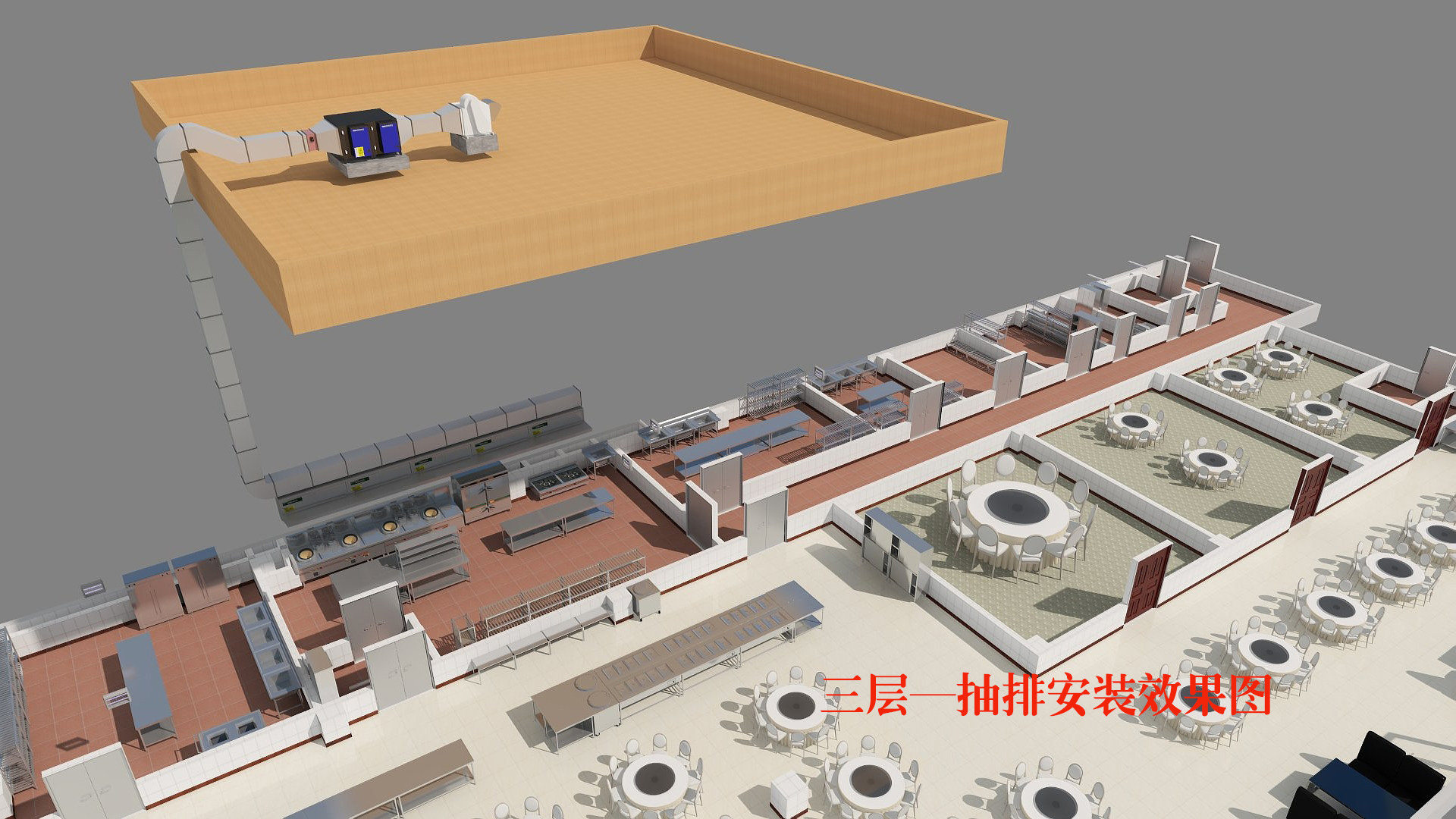(3)由于建筑設計單位不便深入了解廚房現(xiàn)場實際和廚房的要求,所以大多由廚房專業(yè)進行二次設計。由于廚房空間異常緊張.廚房排通風系統(tǒng)設計必須提高設計深度。對管道大小、走向、轉(zhuǎn)彎、進出口、與其他管線空間關系必須清楚。在設計時就需要考慮施工細節(jié)。由于施工有誤差和變更等因泰,實際空間大小必須實地準確測量.才能保證施工質(zhì)量。例如,風機就位安裝,在設計時就要清楚風機的大小、重量、與周邊空間關系,能否運送到位、是否有足夠的安裝檢修空間和荷載。所以,除土建、電力部分需要設計部門后續(xù)設計之外,廚房排煙通風系統(tǒng)設計制圖應該滿足施工要求。
