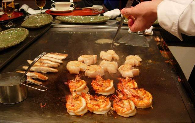 日式鐵板燒是日本料理中最高級別的就餐形式,它不同于中餐的燒烤和韓國燒烤,吃日式鐵板燒是財富和地位的象征。鐵板燒是將食材直接放在熱鐵板上炙烤成熟,這些食材事先不能腌制加工,而是通過高熱的鐵板快速烹調成熟以保留其本身的營養和味道。由于食材事先不能腌制加工,所以它對原材料的要求是相當高的,比如西冷牛肉、菲力牛肉、牛仔骨、銀鱈魚、帶子、鵝肝等等。