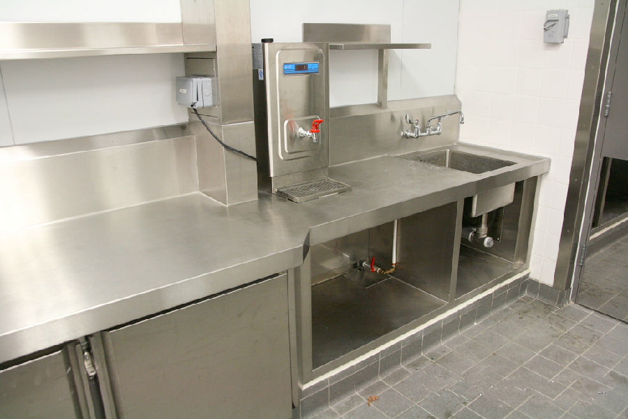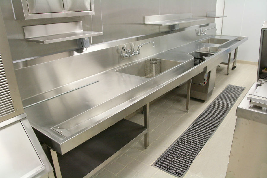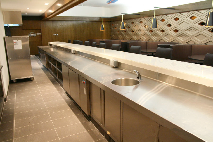 依然是一流的現場無縫焊接工藝,臺面非常平整,對土建(地臺施工),現場焊接工藝,調理臺的制造工藝要求非常高。工作臺的背板用大弧度L型設計,避免藏污納垢,容易清洗。